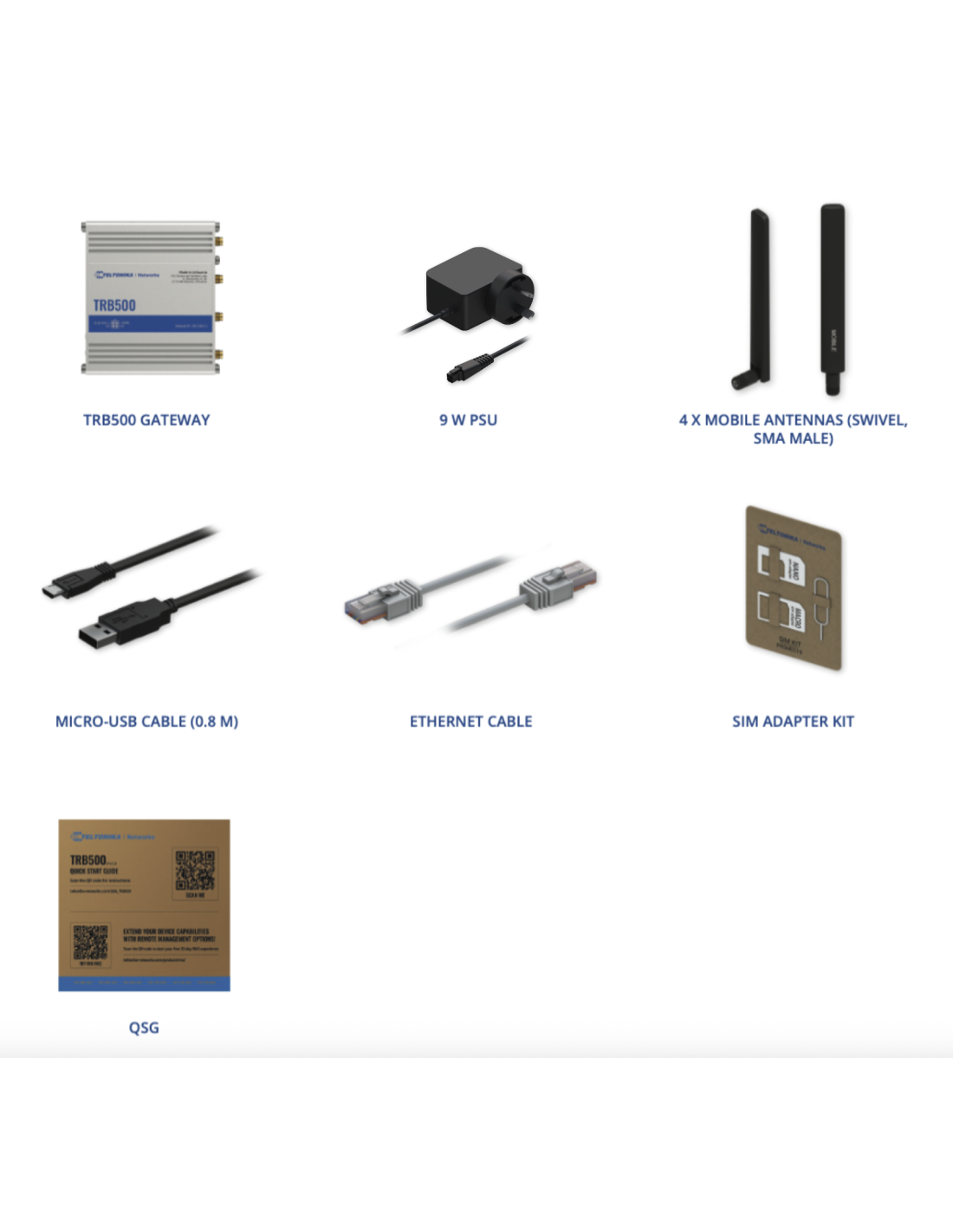 • TRB141 Gateway• 9 W PSU• 1x LTE antenna (magnetic mount, SMA male, 3 m...